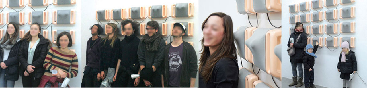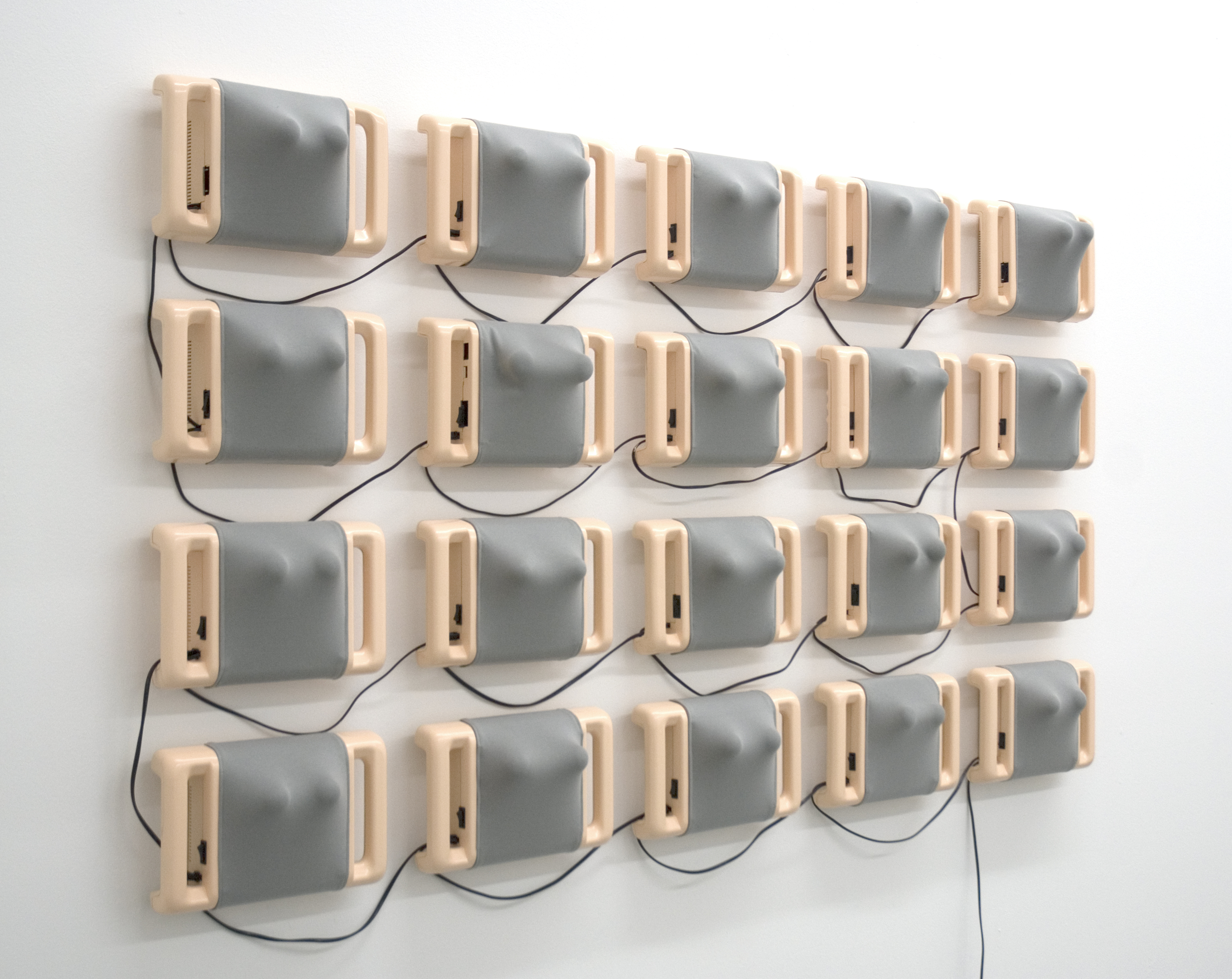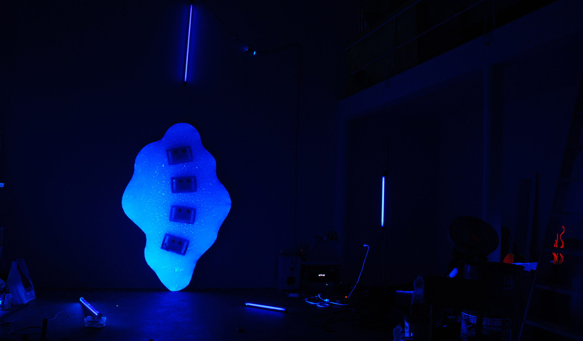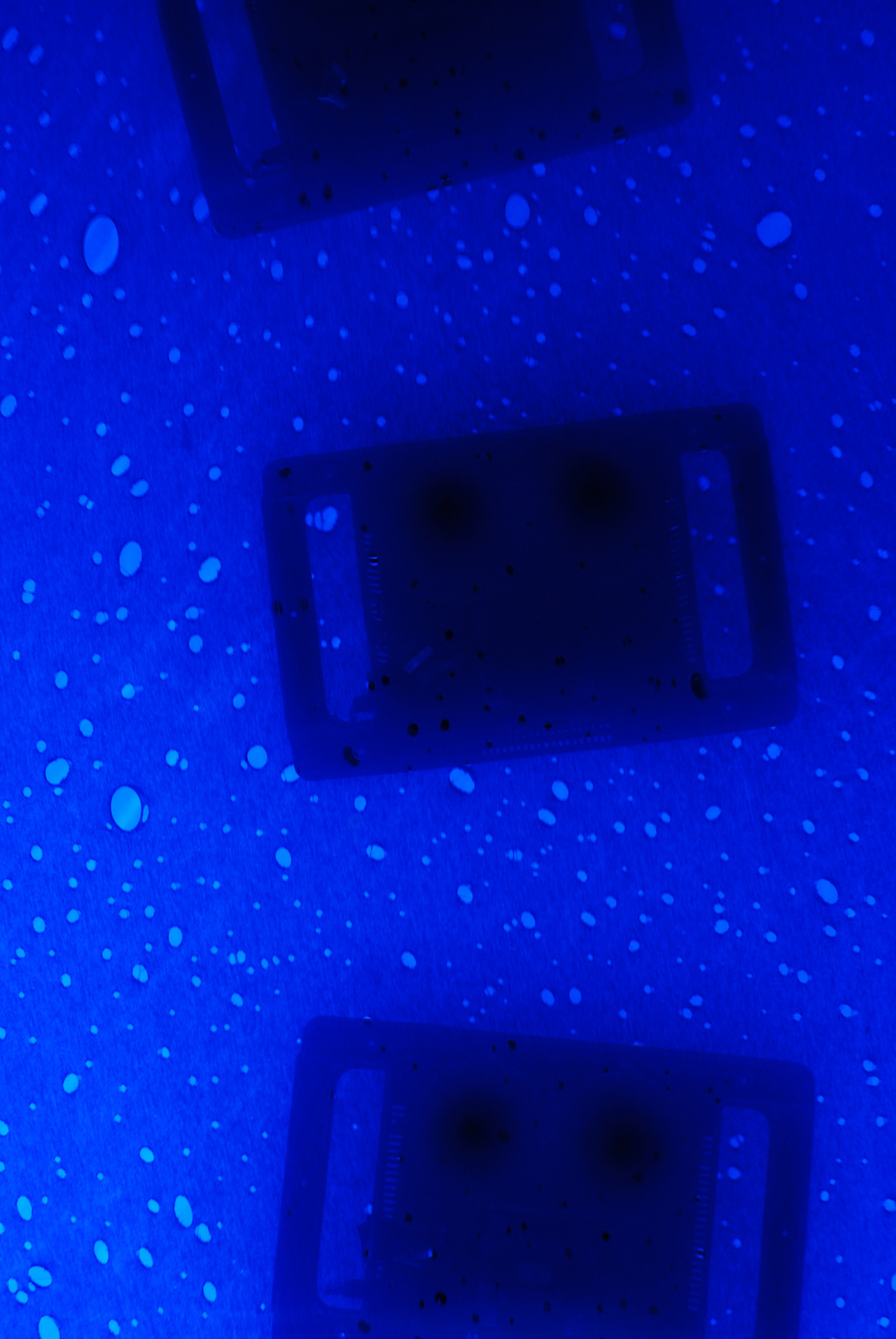 Shiatsu neck massage devices on wooden board behind perforated stretch fabric, UV-lights